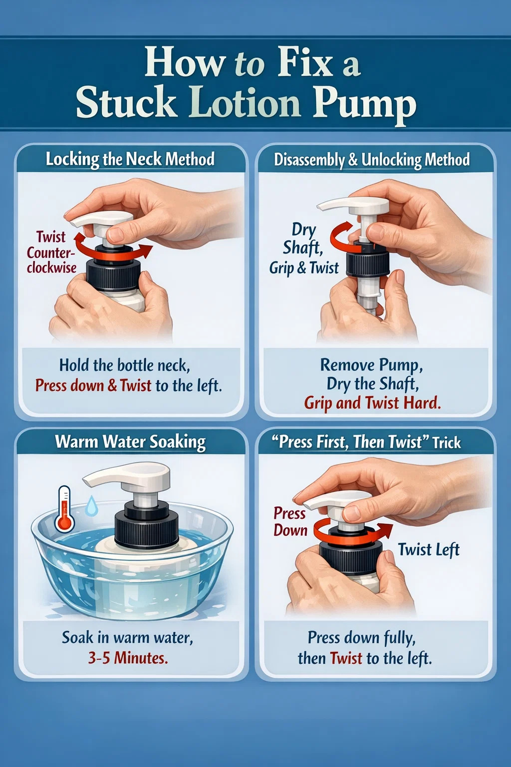 Ini adalah metode yang paling umum dan efektif. Seringkali pompa losion tidak menyembul karena saat Anda memutar kepala pompa bagian atas, tutup botol di bawahnya juga ikut berputar sehingga menghilangkan gaya yang ada.