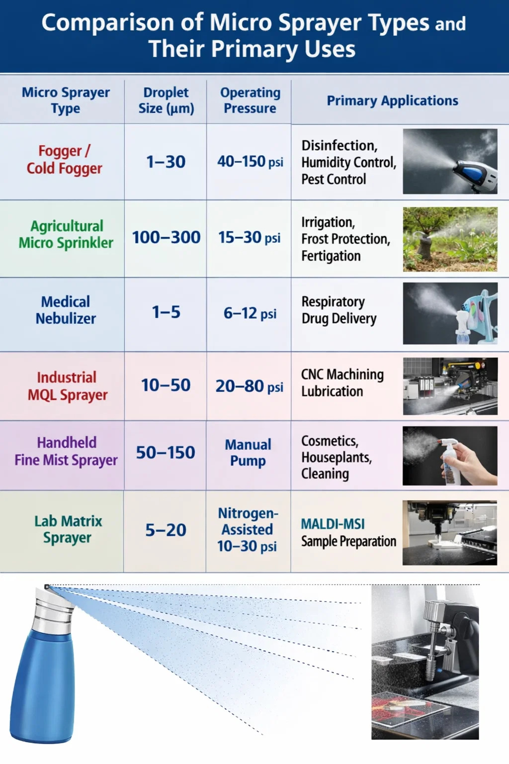 | Tipe Penyemprot Mikro | Ukuran Tetesan (µm) | Tekanan Operasi | Aplikasi Utama |