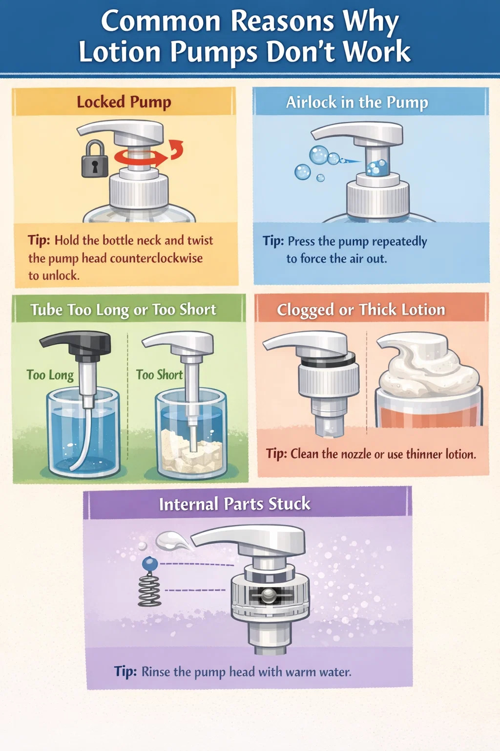 Cukup membuat frustrasi ketika Anda dihadapkan pada produk perawatan kulit favorit Anda tetapi pompa lotionnya tidak berfungsi. Penyebab pompa tidak berfungsi biasanya tersembunyi dalam beberapa detail yang tidak mencolok.
